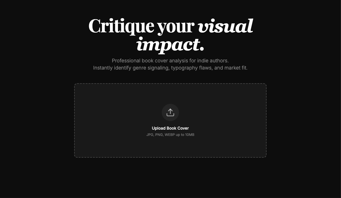 Cover Clarity App A free professional book cover analysis app for indie authors. Identify genre signaling, typography flaws, and market fit. Visit Google AI Studio to Try it Out (You will need to log in to your Google account to try it)